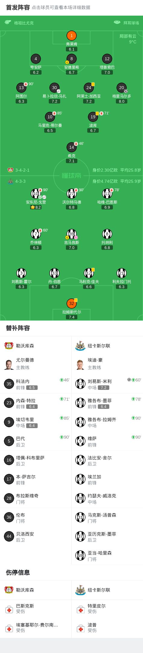 勒沃库森2-2纽卡,戈登传射,吉马良斯乌龙,米利、格里马尔多破门